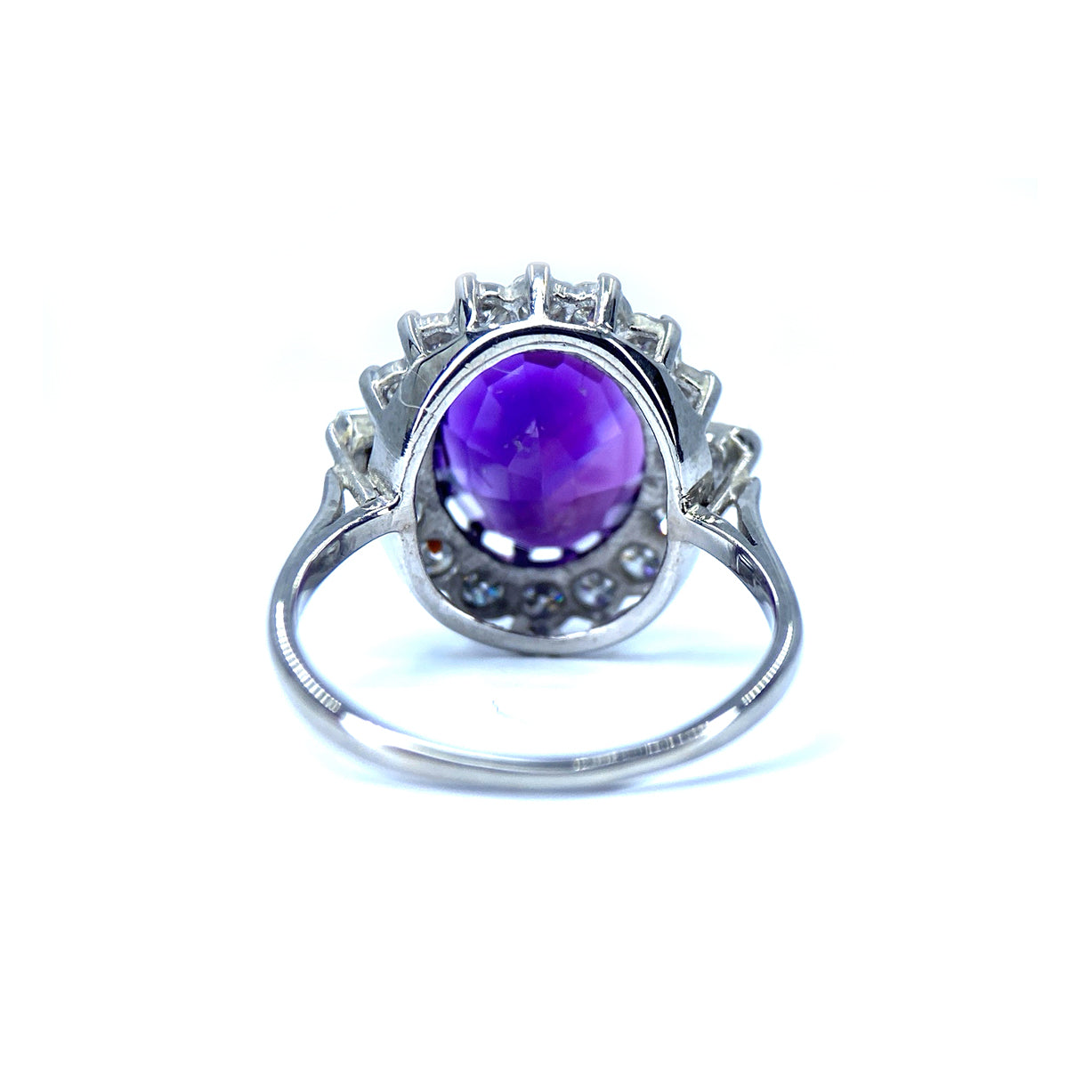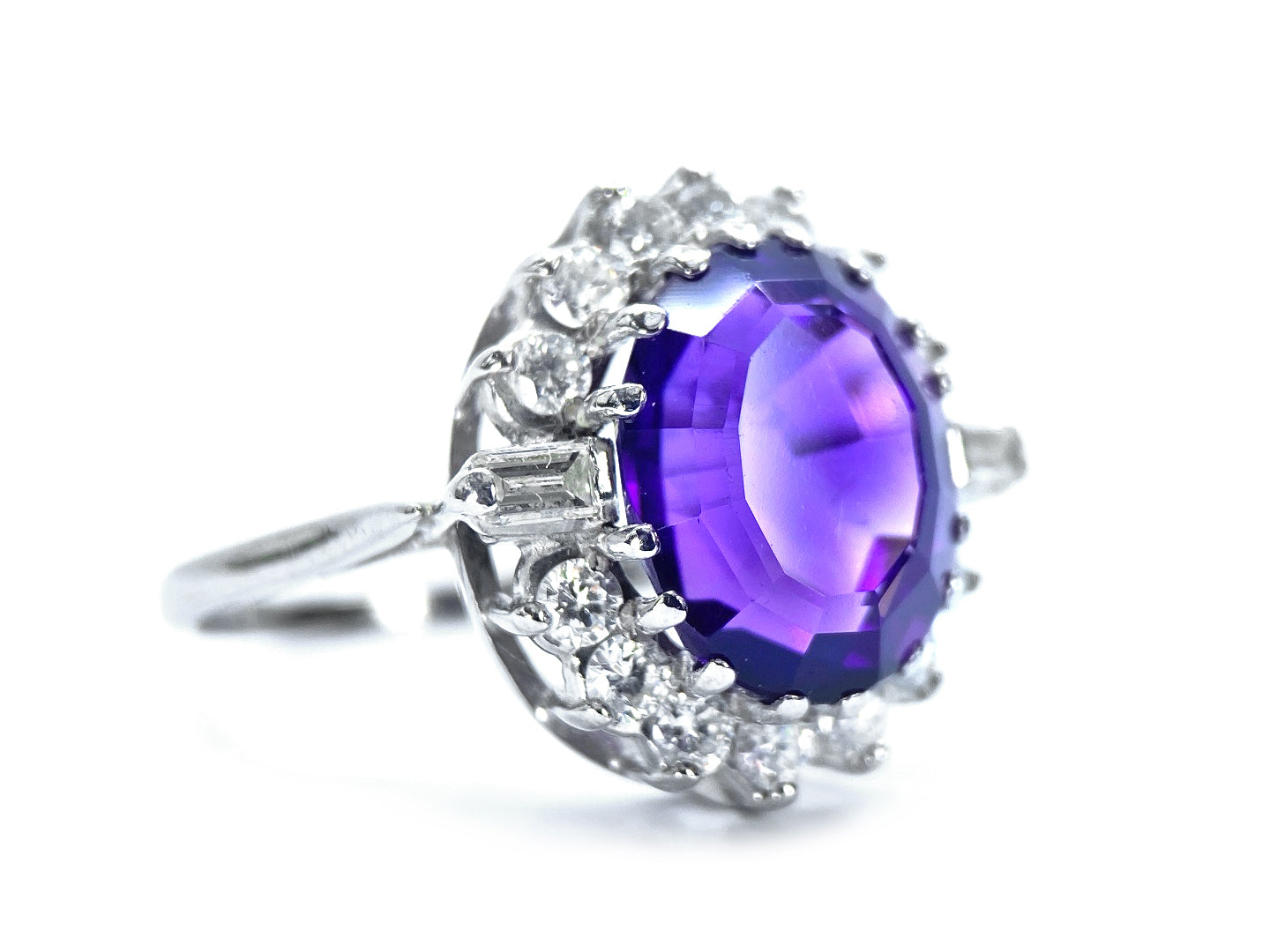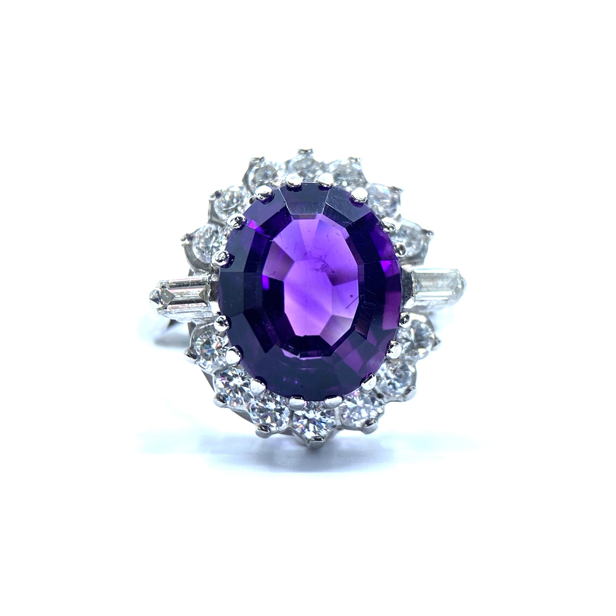 The oval amethyst is a good colour and has two baguette diamonds each side approximately 0.05 carats each plus 14 brilliant cut diamonds surrounding the amethyst approximately 0.05 carats each. Total diamonds 0.80 carats. All set in 18 carat white gold. The setting measures 15.25 mm x 17.75 mm across Weight 5.50 grams