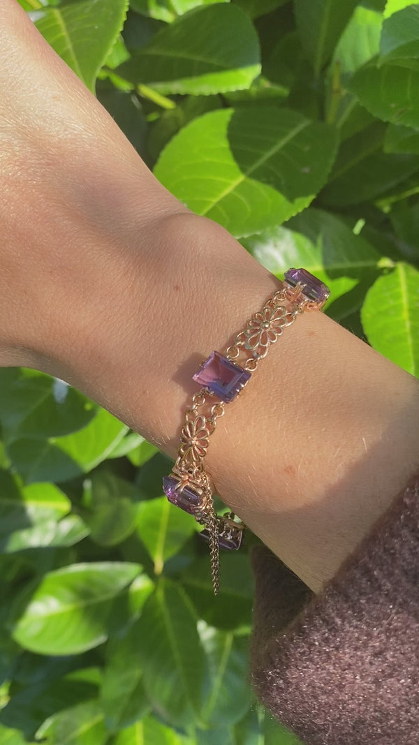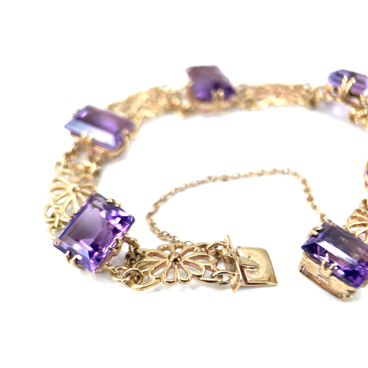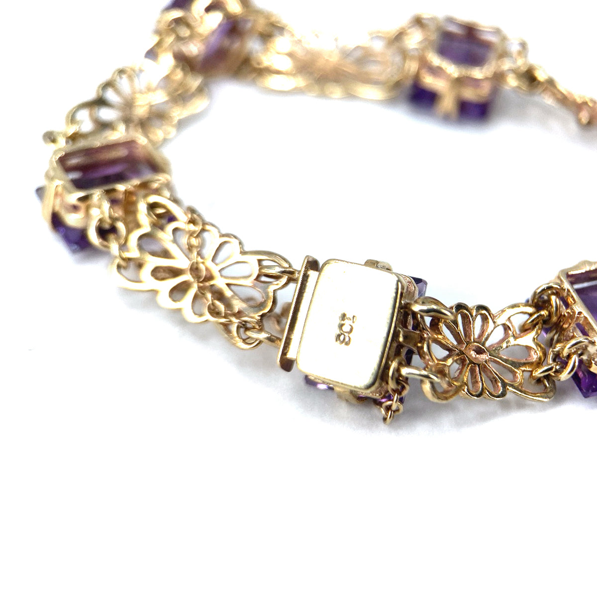This pretty bracelet has 5 well matched amethysts 3.15 carats each = 18.90 carats. It has 9 carat yellow gold fancy panels between each amethyst. The bracelet measures 7 1/2 inches (19 cms) in length. It has push tongue clasp and a safety chain. Weight 16.26 grams.