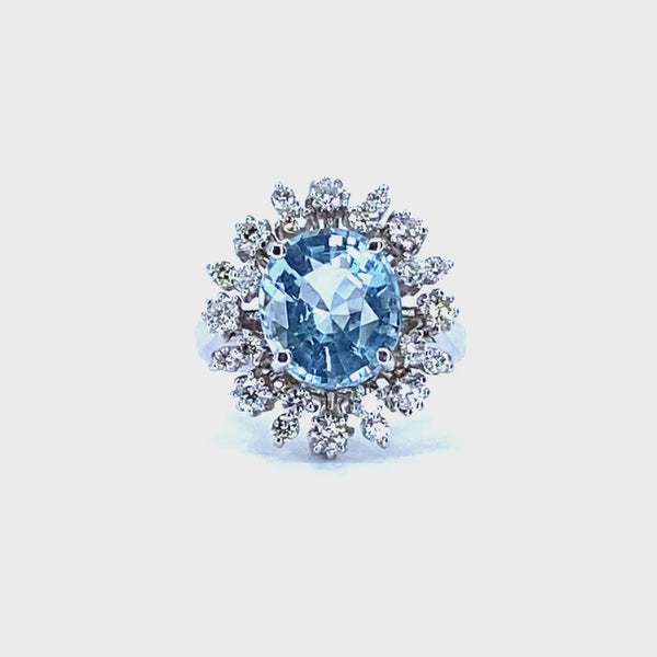 The pretty aquamarine is approximately 3.50 carats and has a double row of diamonds surrounding the aquamarine. 8 diamonds approximately 0.07 carats each plus 16 more diamonds approximately 0.03 carats = 1.04 carats all set in 14 carat white gold. The setting measures 18.58 mm x 17.47 mm across. The ring size is N but we have a superb jeweller who Can resize without a trace. Weight 5.79 grams.