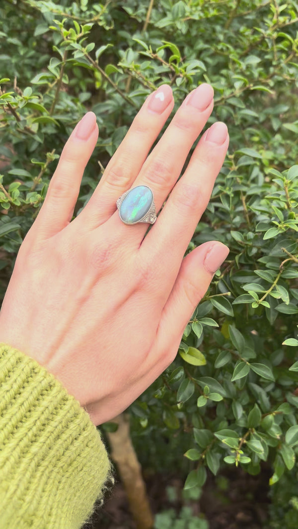 This lovely oval opal is approximately 5.36 carats with approximately 0.49 carats of diamonds on the shoulders. All set in platinum. The setting measures 21.37 mm x 21.28 mm across including the shoulders. The ring size is N 1/2 but we have a superb jeweller who can resize without a trace. Weight 6.26 grams.