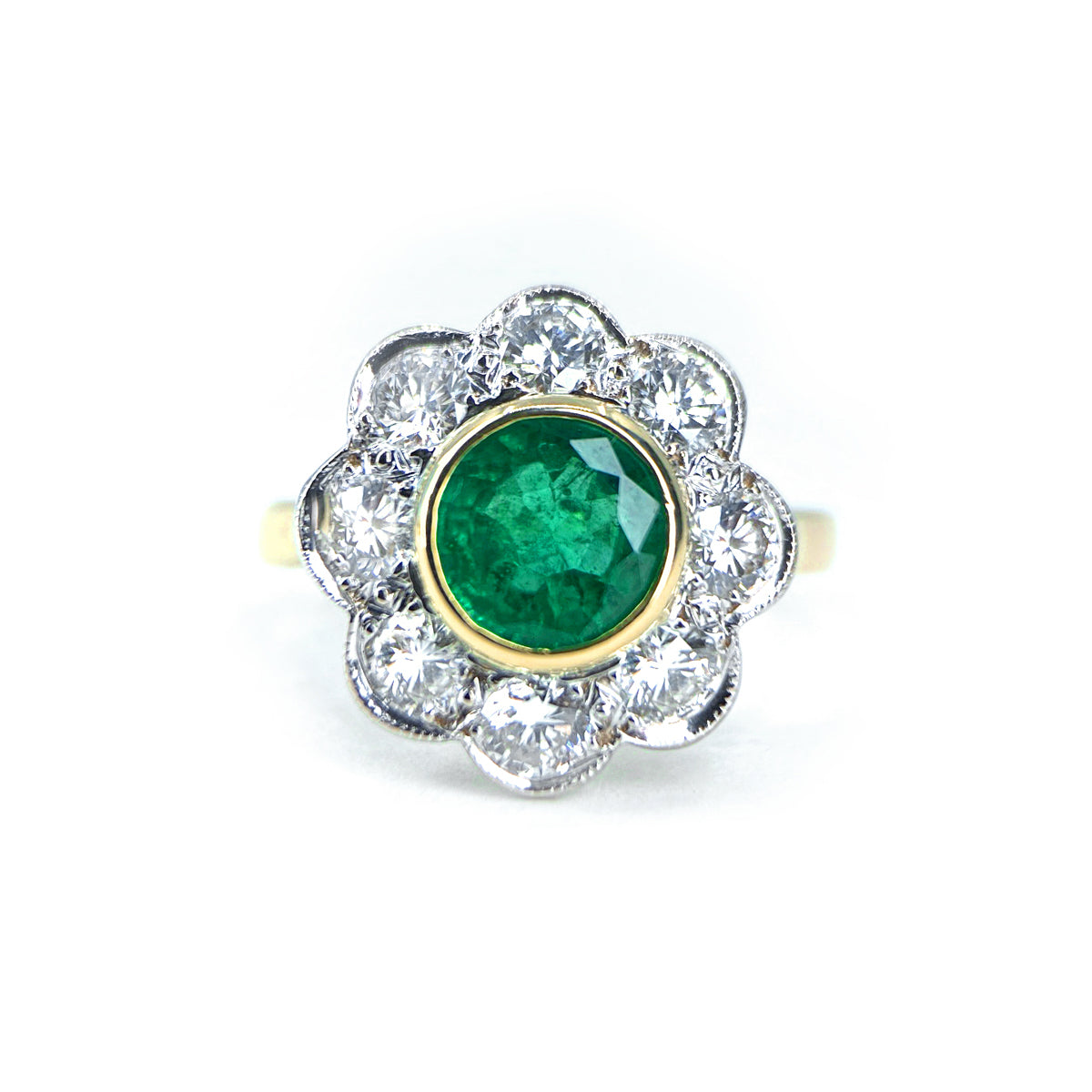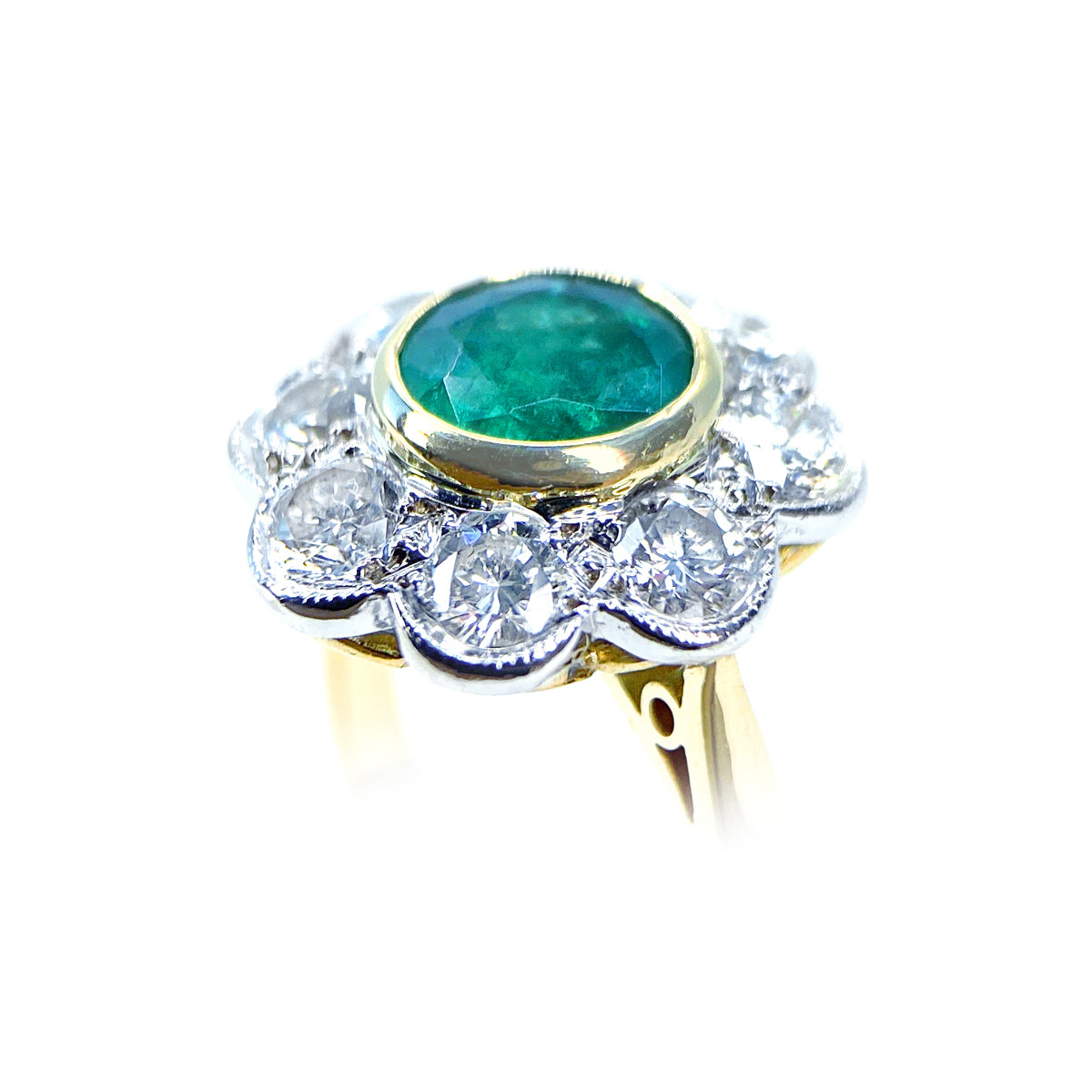 This really is a beautiful emerald ring. The emerald which is a lovely colour Is approximately 1.00carat. Surrounded by 8 beautiful diamonds totalling approximately 0.80 carats All set in 18 carat white gold with an 18 carat yellow gold band. The setting measures 15.39 mm across. The ring size Is M but we have a superb jeweller who can resize without a trace. Weight 5.37 grams.
