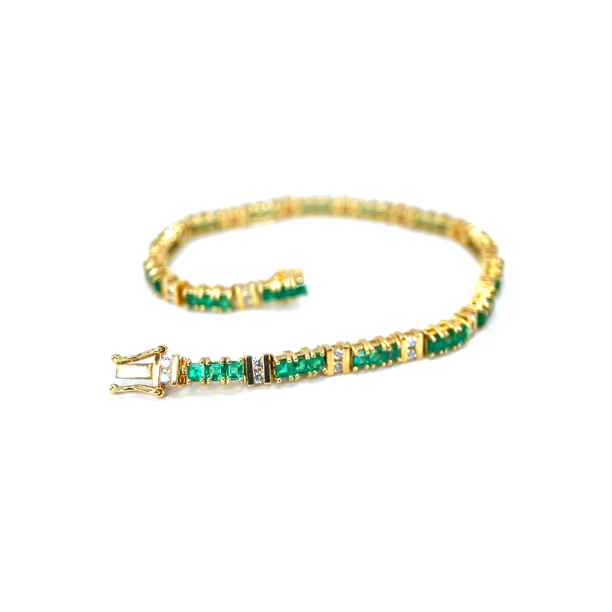 This lovely bracelet has 48 square cut emeralds approximately 0.05 carats each = 2.40 carats and 32 brilliant cut diamonds approximately 0.015 carats each = 0.48 carats. All set in 14 carat yellow gold. The bracelet measures just over 7 inches. (18 cms) in length. It has a very secure clasp with 2 figure of eight safety hooks. Weight 12.62 grams.