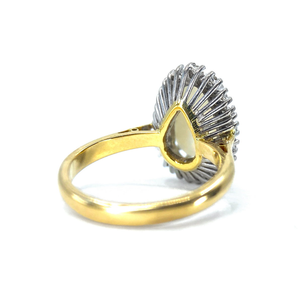 This opal is approximately 1.15 carats surrounded by 17 diamonds approximately 0.03 carats each = 0 .51 carats all set in 18 carat yellow gold. The setting measures 14.60 mm x 13.40 mm across. The ring size is K 1/2 but we have a master jeweller who can resize Without a trace. Weight 4.70 grams.