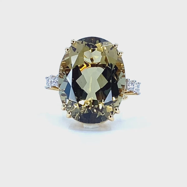 This smart ring has an beautifully facetted oval green beryl approximately 17.50 carats with princess cut diamonds on the shoulders . 4 diamonds approximately 0.08 carats each = 0.32 carat total. All set in a beautiful 18 carat yellow gold setting The ring measures 19.79 mm x 16.98 mm across. The ring size is N 1/2 but we have a superb jeweller who can resize without a trace. Weight 0.31 grams.
