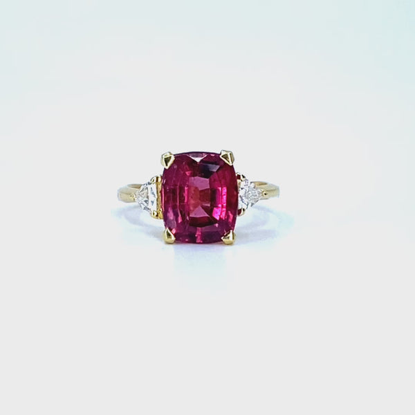 This pretty ring has a beautiful pink tourmaline measuring approximately 3.10 carats and two triangular diamonds approximately 0.22 carats each Totalling 0.44 carats. All set in 18 carat yellow gold. The setting measures 10.14mm x 14.35mm across. The ring size is L but we have a superb jeweller who can resize without a trace. Weight 4 grams