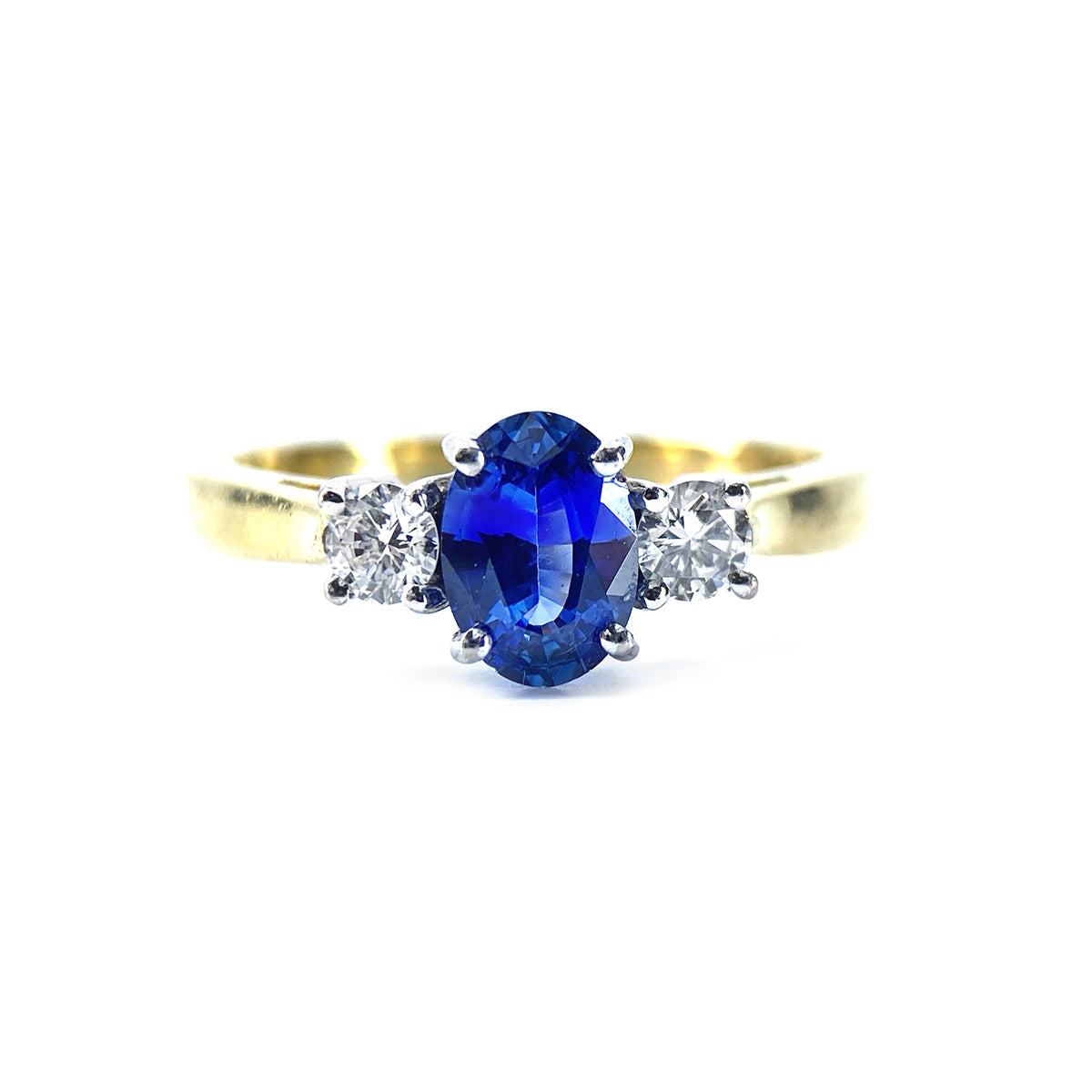 The oval sapphire is 0.79 carats (inscribed inside the band) plus two diamonds approximately 0.10 carats each = 0.20 carats Set in 18 carat white gold with an 18 carat yellow gold band. This would make a lovely engagement ring. The setting measures 12.80 mm across. The ring size is L 1/2 but we have a superb Jeweller who can resize without a trace.