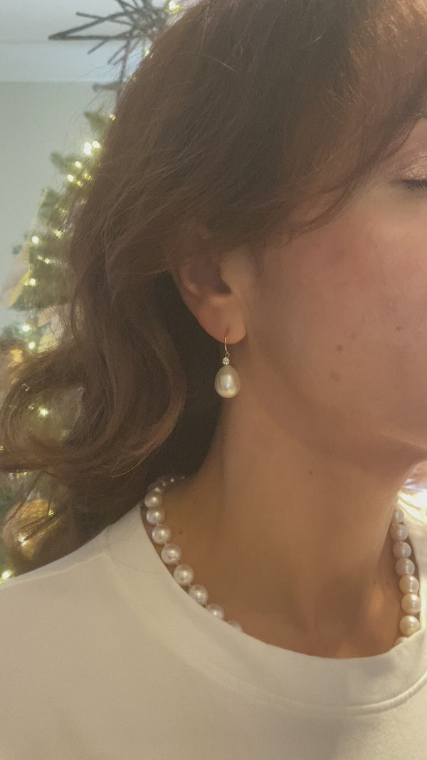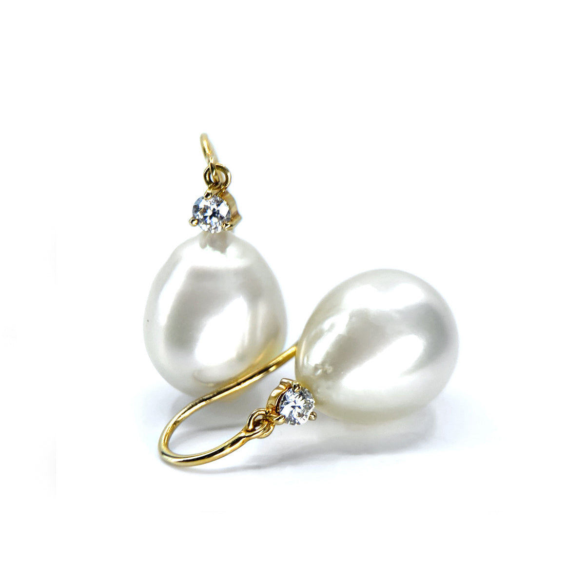 These earrings each have a South Sea Pearl measuring approximately 15.50 mm X 12.25 mm. and a diamond approximately 0.10 carats each set in 18 carat yellow gold Weight 7.38 grams.